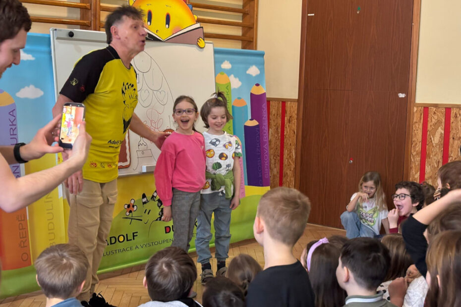 Pochmurné únorové dny nám přišel do školní družiny rozzářit ilustrátor dětských knih Adolf Dudek. Na vystoupení malíře se vždy všichni moc těšíme. Jeho gejzír energie a nápadů je nakažlivý a inspirující. Letošní setkání proběhlo v úterý 24. února. Ilustrátor nás s humorem sobě vlastním provázel pohádkovým světem: osvobodili jsme zakletou Šípkovou Růženku, fandili Koblížkovi, ať uteče mlsným zvířátkům, zdobili jsme perníčky na perníkové chaloupce a doufali, že dědeček s pomocníky vytáhne velikou řepu. Na této pohádkové cestě Adolfu Dudkovi s radostí pomáhaly i naše děti. Vystoupení bylo protkáno spoustou vtípků, písniček a říkanek. Nechyběla ani pantomima a pohyb. Prostě vystoupení pro děti, tak jak má být. Tak zase za rok!
