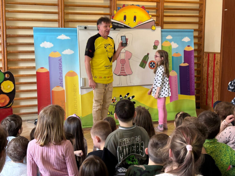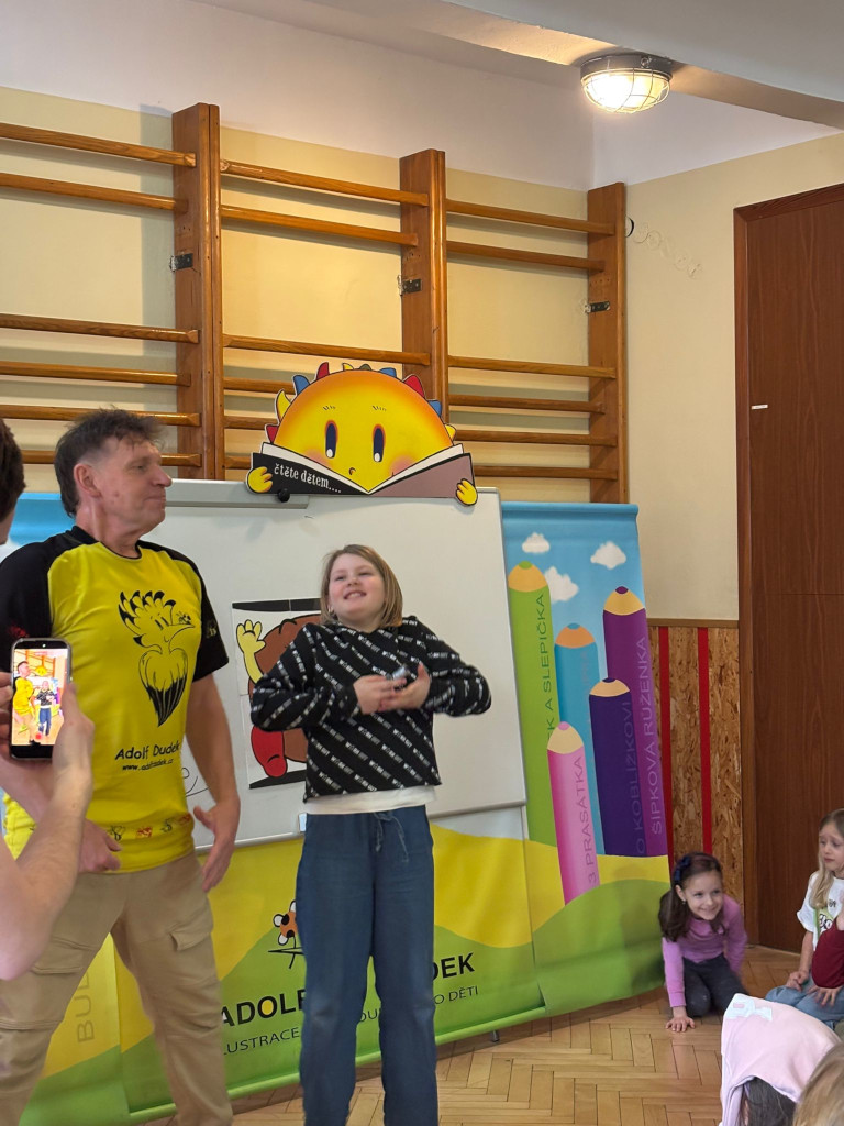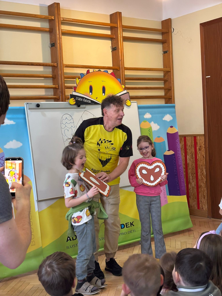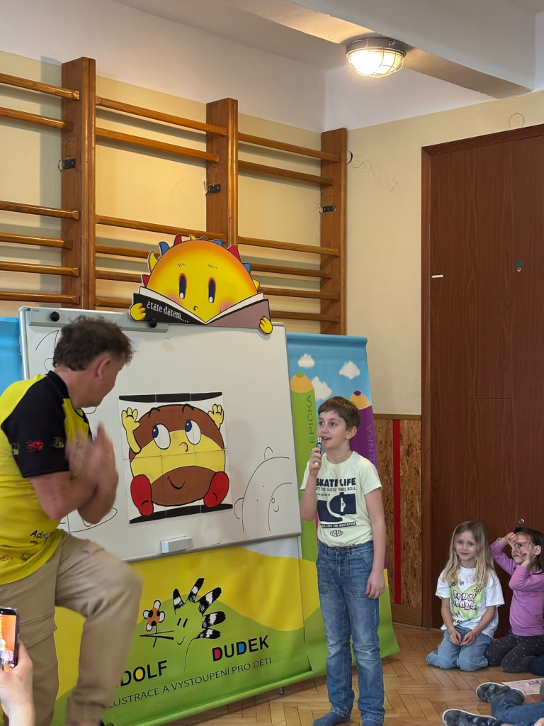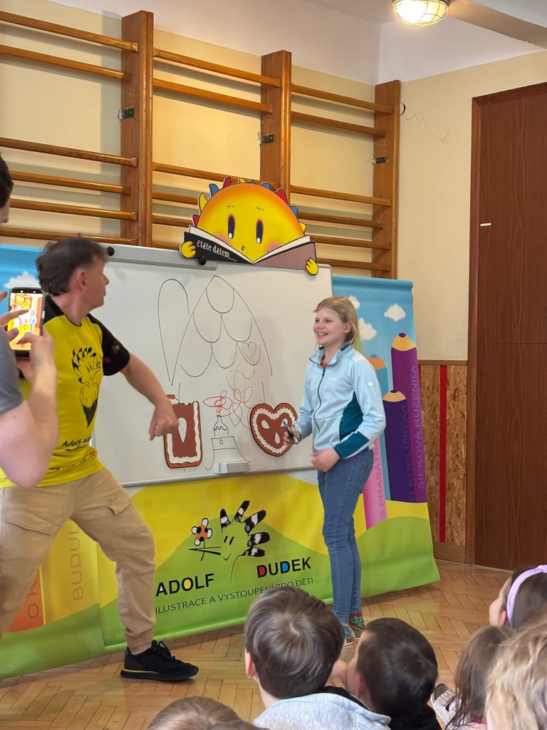 Pochmurné únorové dny nám přišel do školní družiny rozzářit ilustrátor dětských knih Adolf Dudek. Na vystoupení malíře se vždy všichni moc těšíme. Jeho gejzír energie a nápadů je nakažlivý a inspirující. Letošní setkání proběhlo v úterý 24. února. Ilustrátor nás s humorem sobě vlastním provázel pohádkovým světem: osvobodili jsme zakletou Šípkovou Růženku, fandili Koblížkovi, ať uteče mlsným zvířátkům, zdobili jsme perníčky na perníkové chaloupce a doufali, že dědeček s pomocníky vytáhne velikou řepu. Na této pohádkové cestě Adolfu Dudkovi s radostí pomáhaly i naše děti. Vystoupení bylo protkáno spoustou vtípků, písniček a říkanek. Nechyběla ani pantomima a pohyb. Prostě vystoupení pro děti, tak jak má být. Tak zase za rok!