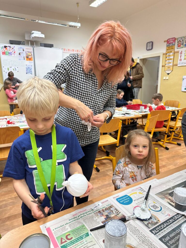 Pod vedením paní Šárky Žárské a za aktivní pomoci rodičů si děti vyrobily vánočního sněhuláka z plechovky a polystyrenové koule. Každý sněhulák byl originál a odrážel dětskou fantazii i pečlivou práci malých tvůrců. Vznikaly tak krásné dekorace, které si děti donesly domů, aby jim vánočně vyzdobily domácnost. Tvoření bavilo malé i velké, jen jeden malý bráška celé adventní odpoledne spokojeně prospal a vánoční atmosféru si tak užil po svém.
