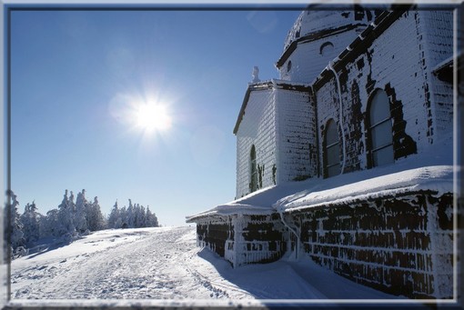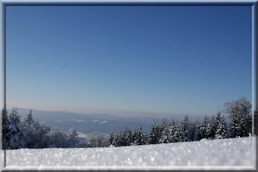 Slunce svítí Sníh se třpytí Mráz všude kolem Stromy posypané bílým sněhem Hory zahalené bílým mrakem Josef