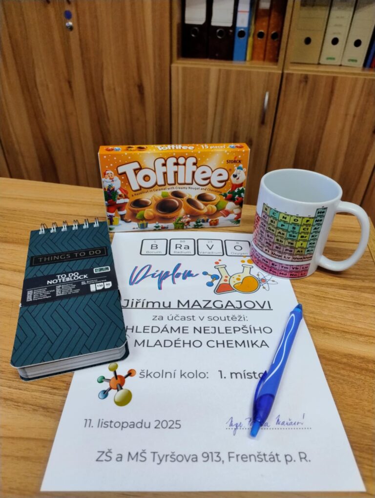 V pátek 31. října 2025 se 13 žáků devátého ročníku naší školy zúčastnilo školního kola 14. ročníku celorepublikové soutěže Hledáme nejlepšího mladého chemika. Soutěžící čekal test, ve kterém mohli získat maximálně 60 bodů.
