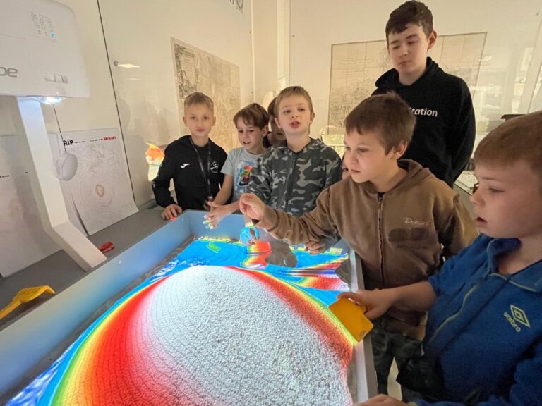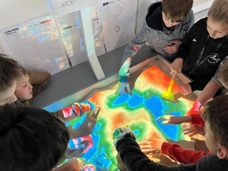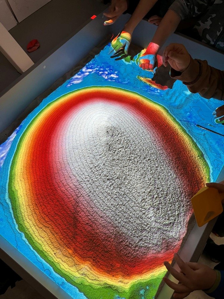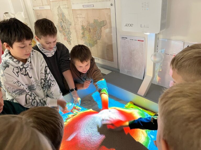 Velkým zážitkem pro všechny se stal pískový model krajiny s rozšířenou realitou. Pomocí rukou jsme mohli tvořit a měnit tvary krajiny – zvedat hory, prohlubovat údolí, vytvářet nížiny – a sledovat, jak se barvy a vrstevnice na projekci okamžitě přizpůsobují našim úpravám. Vidět, jak se teorie o mapách proměňuje v živý obraz, bylo fascinující a pro mnohé i nezapomenutelné.