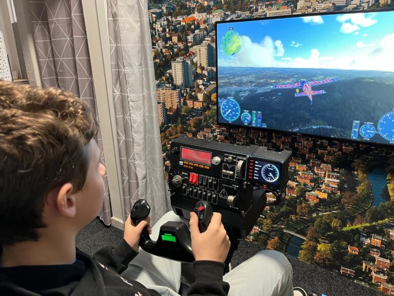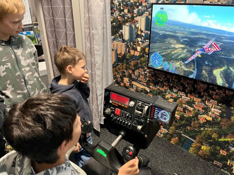 Nechyběl ani letecký simulátor, který si žáci mohli sami vyzkoušet. Usedli do pilotní kabiny, chopili se kniplu a zkusili řídit tryskáč. Rychle zjistili, že pilotování rozhodně není jednoduché, ale o to větší obdiv si získali ti, kteří v reálném světě pořizují letecké snímky pro tvorbu map.