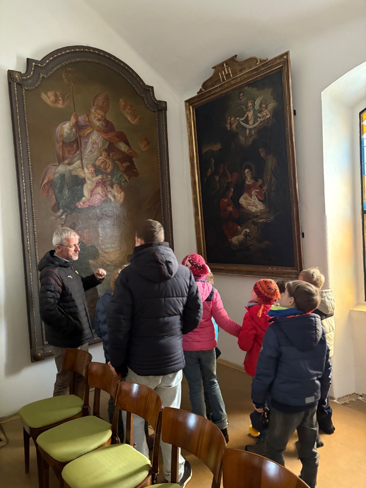 Navštívili jsme také zpovědnici, místo ticha a smíření, kde se děti dozvěděly, jakou roli hraje ve svátostném životě věřících. V interiéru kostela jsme obdivovali sochy, obrazy i vitráže. Informace o původu konkrétních soch se ve veřejně dostupných zdrojích nepodařilo dohledat, přesto děti zaujala jejich výtvarná hodnota i výraz. Zmíněny byly také obrazy Albína Poláška, významného rodáka, a barevné vitráže, které dodávají prostoru proměnlivou atmosféru podle dopadajícího světla.