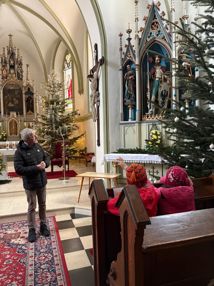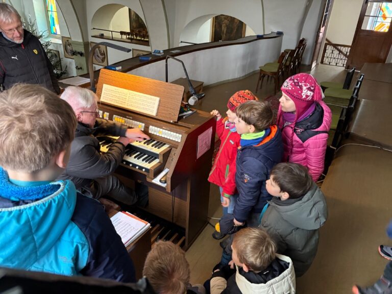 Po úzkých schodech jsme vystoupali až na kruchtu, vyvýšenou galerii, kde stojí varhany. Odtud se otevřel neobvyklý pohled na celý interiér kostela – na místo, které známe z lavic, ale z této výšky působí téměř jako jiný svět. Varhaník nám zahrál známé vánoční koledy a děti se spontánně přidaly zpěvem. V tu chvíli se chrám naplnil měkkým světlem, hudbou a pocitem, že vánoční atmosféra ještě úplně neodezněla.