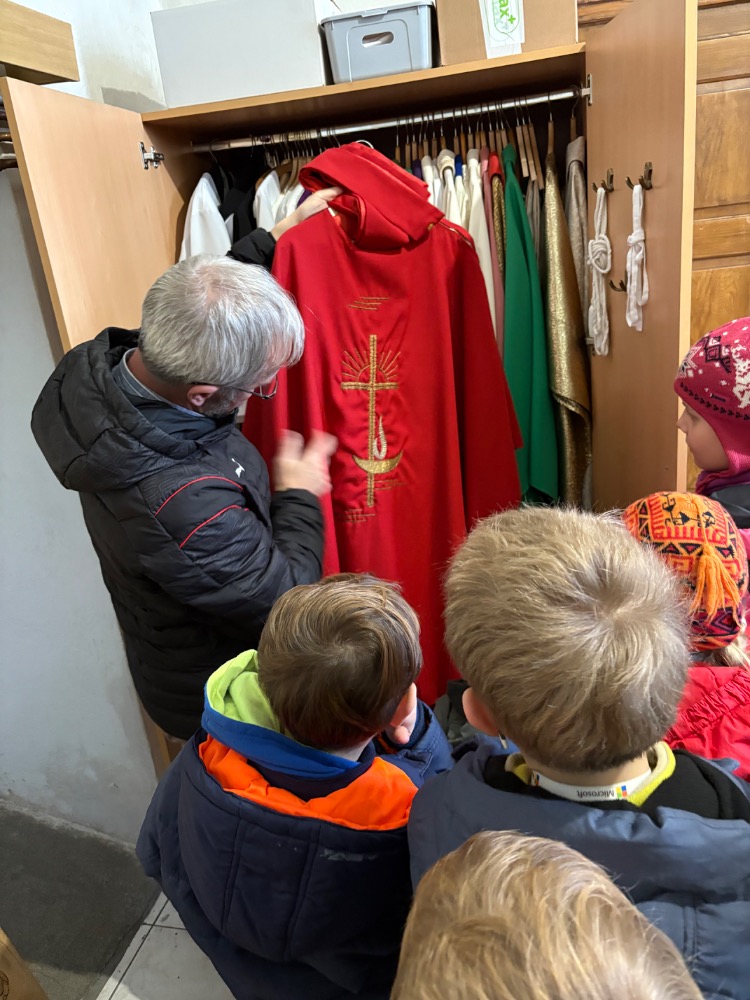 Jedním z nejzajímavějších zastavení byla zákristie, prostor, kde se kněz připravuje k bohoslužbě a kde se ukrývá mnoho liturgických předmětů, které běžný návštěvník nevidí. Děti zde mohly zblízka obdivovat liturgická roucha a poznat jejich názvy i symboliku. Zaujala je alba, dlouhá bílá tunika symbolizující čistotu, i jednoduché cingulum, provazový pás. Velkou pozornost vzbudila štola, znak kněžské služby, a především ornát, slavnostní vrchní roucho, jehož barva se mění podle liturgického období. Právě barvy rouch vyprávějí svůj vlastní příběh – bílá patří k radosti Vánoc a Velikonoc, zelená k naději všedních dní, fialová k adventnímu a postnímu ztišení, červená k mučedníkům a Duchu svatému a růžová k radostným nedělím uprostřed období pokání. Děti tak nahlédly do symbolického jazyka, kterým církev komunikuje už po staletí.