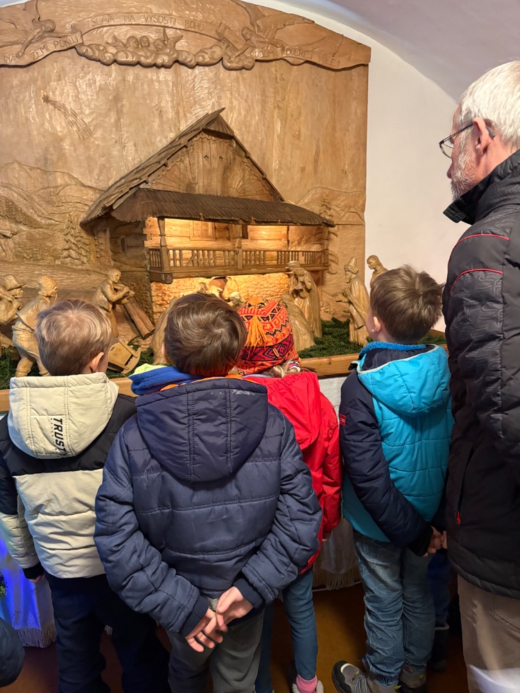 V hlavní lodi nás zaujal dřevěný betlém a příběh jeho tradice. Děti se dozvěděly, že první živý betlém vytvořil v roce 1223 sv. František z Assisi v italském Grecciu, aby lidé mohli příběh Vánoc prožít co nejvíce autenticky.